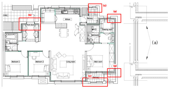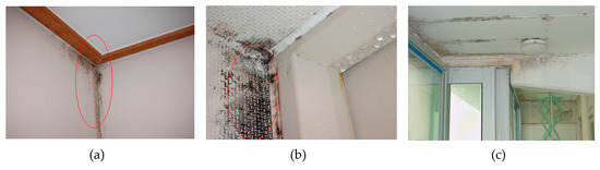 The floor plan of a general apartment in Korea is shown in Figure 1. The key areas susceptible to condensation are marked as (a), (b), and (c) (Figure 2), and the respective photos are presented in Figure 3.