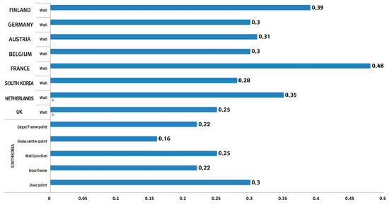 France uses a TDR of 0.48 at an indoor temperature of 18 °C and a relative humidity of 55%. Belgium uses a TDR value of 0.30 only for residential buildings, while Finland uses 0.39 for an indoor temperature of 21 °C and a relative humidity of 52%. Austria’s TDR is 0.30 when the room temperature is 20 °C and the relative humidity is 65% (Figure 4).