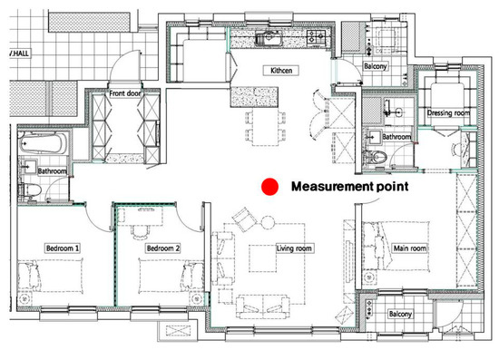 An MSR 145 logger (MSR, Switzerland) was used to measure and record the indoor temperature and humidity. The logger automatically measured and stored the temperature and relative humidity data between −20 and −65 °C and in the range of 0–100%, respectively, with accuracy levels of ±0.5 °C and ±2%, respectively. The logger was installed in the living room of each apartment (Figure 5). To prevent the influence of radiant heat from heaters or direct sunlight through windows, the device was attached to a wall or to furniture at a height of 1.5 m. After one week, the logger was retrieved from the household. Outdoor temperature and humidity data were obtained from the nearest Korea Meteorological Administration weather station.