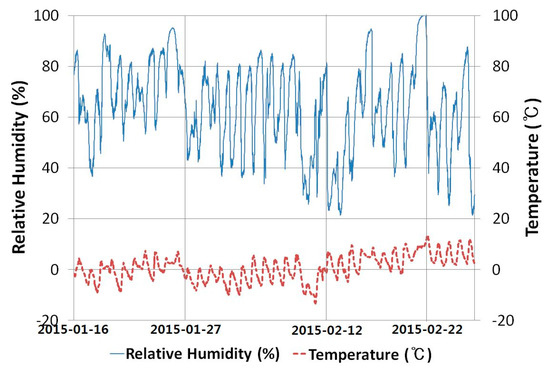 The cumulative average temperature for winter (December to February) in Korea is 10.6 °C, and the relative humidity ranges from 49.1% to 72.3% [35]. The average outdoor temperature during the period from January 15 to February 10, 2015, was 13.66 °C, with a low temperature of −13.46 °C. The relative humidity ranged from 21.4% to 100%, at the most (Figure 6).