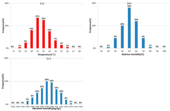 4.2. Distributions of the Indoor Temperature, Relative Humidity, and Absolute Humidity