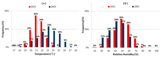 Comparing the temperature and humidity results from 2003 and 2015, the mean temperature values were not found to have differed greatly. However, the average relative humidity was 8.1% higher in 2015 than in 2003 (Table 5).