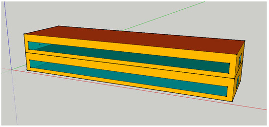 An office building with two floors is drawn in Google Sketchup to create the 3D building model, as shown in Figure 1. The area of the building is 1153.04 m2, the height is 8.4 m, and the window-wall ratios are listed in Table 1. The office building is located in Suzhou city, which is in the hot summer and cold winter region of China. In order to control and standardize the heat transfer through the building envelope, the thermal property parameters of the building envelope are designed using the baseline values of the Chinese national standard “Design Standard for Energy Efficiency of Public Buildings (GB 50189-2015)” [32]. This method for creating a reference building model using baseline of design standard for studying energy efficient building design has been used by many researchers [33,34,35]. The main parameters are listed in Table 2.