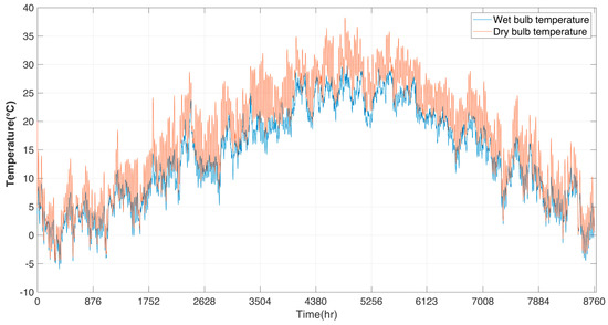 The Suzhou weather data of a typical meteorological year is imported by Meteonorm 7.0 through the Type 15-2 (weather data) component of the TRNSYS simulation model [36]. A typical meteorological year for Suzhou is illustrated in Figure 3, which shows typical air temperature characteristics for a hot summer and cold winter climate region of China.