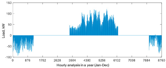 The yearly dynamic heating and cooling load of the office building is calculated and results are shown in Figure 4 and Table 3. As can be seen, the yearly accumulated cooling load is 70,673 kwh, and heating load is 24,735 kwh. By calculating the simulation result, it is found that the heating and cooling load imbalance ratio is about 65% in this case.