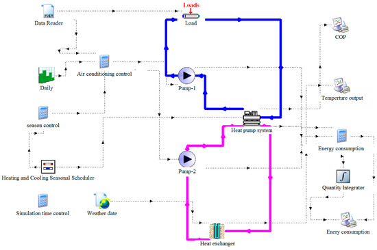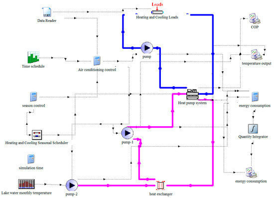 The monthly water temperature of the lake is imported to the simulation model by component Type 518 (Water Monthly Temperature). Component Type 682 (Load) represents the building’s heating and cooling load calculated for the system [36]; other necessary components for calculating, controlling, and processing data are created and connected in the WSHP simulation model.