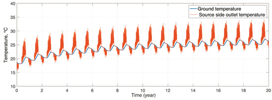 Source side outlet and ground temperature of GSHPs over a 20-year operation period.