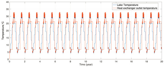 Heat exchanger outlet temperature and lake temperature of WSHP over a 20-year operation period.
