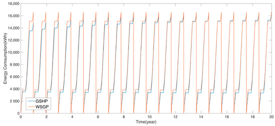 Figure 13 illustrates the heat pump energy consumption of the GSHP system and the WSHP system over a 20-year operation period. As can be seen, the GSHPs’ heat pump energy consumption gradually increases. According to the simulation results, the accumulated energy consumption of the GSHP heat pump is 14,893.25 kWh in the first year of operation, while in the 20th year of operation the accumulated energy consumption is 16,587.7 kWh. For the WSHP system, the yearly energy consumption stays constant at 16,577.35 kwh over the 20-year operation period. Compared with the GSHP system, the WSHP system’s energy consumption is higher in the beginning, but as the GSHP system’s heat pump energy consumption increases every year, its energy consumption is higher than the WSHP system after operating for 20 years. Therefore, the GSHP system has no advantage over the WSHP system after operating over the long term in Suzhou.