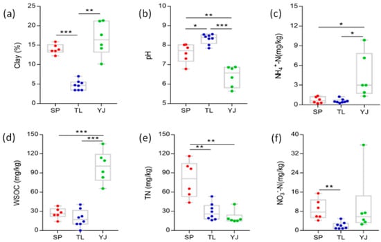 Soil physicochemical properties among crop land (Siping, SP, red dotsr), agricultural-pastoral interlaced land (Tongliao, TL, blue bots), and artificial economic forest land (Yanji, YJ, green dots). (a–f) represents clay content, pH, NH4–N, WSOC, TN, and NO3–N, respectively. Significant levels of each path were as follows: * p < 0.05, ** p < 0.01, and *** p < 0.001. WSOC, water soluble organic carbon; TN, total soluble nitrogen. Different land use types.
