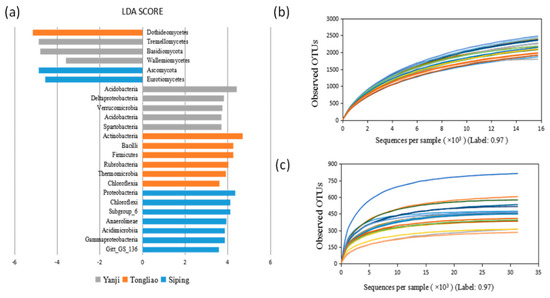 Effect size (LEfSe) analysis of microbial abundance in soil of different land use types, agricultural-pastoral interlaced land (Tongliao), crop land (Siping), and artificial economic forest land (Yanji). Linear discriminant analysis (LDA) scores of fungal biomarkers are on the left side and those of bacterial biomarkers are on the right (a). Rarefaction curves of bacteria (b), and fungi (c).