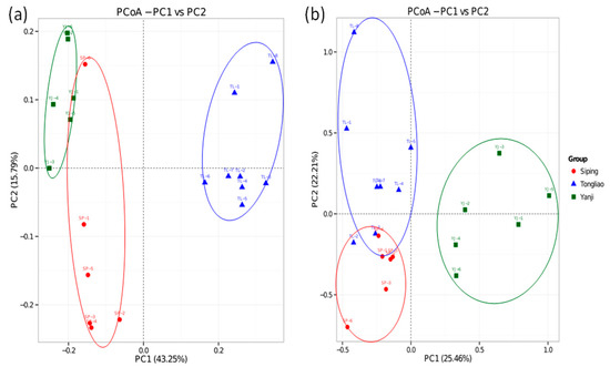 Principal coordinates analysis (PCoA) of the bacterial community (a) and fungal community (b) based on weighted UniFrac distance in soils of different land use types, agricultural-pastoral interlaced land (Tongliao), crop land (Siping), and artificial economic forest land (Yanji).