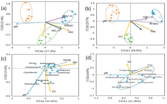Canonical correspondence analysis (CCA) of environmental variables and the dominant (a) bacterial community (>1%), (b) fungal community (>0.1%), and (c) bacterial classes and (d) fungal classes in soils of different land use types, agricultural-pastoral interlaced land (Tongliao, TL), crop land (Siping, SP), and artificial economic forest land (Yanji, YJ).