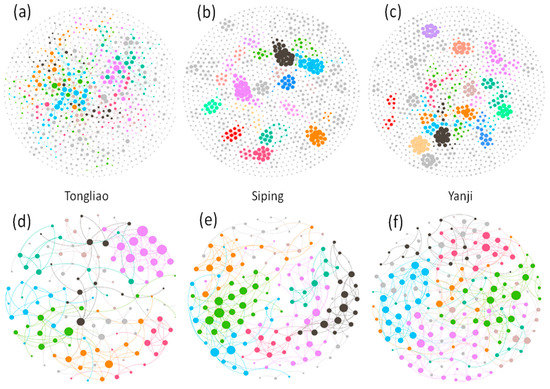 Network analysis depicting association patterns among the bacterial community (a–c) and the fungal community (d–f) in soils of different land use types, agricultural-pastoral interlaced land (Tongliao), crop land (Siping), and artificial economic forest land (Yanji). The nodes were colored according to modularity class; the size of each node was proportional to the number of the connection, that is, the degree.