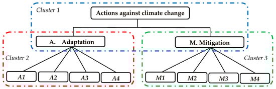 The methodological structure of this tool is given by three stages: Modeling, evaluation, and prioritization. During the modeling stage, the problem is defined (i.e., identification of farmers’ preferences for mitigation and adaptation actions). In this case, the appropriate criteria were identified from a literature review []. The identified criteria are shown in Table 1.
