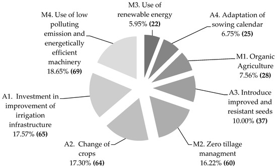 According to the relative relevance assigned to adaptation and mitigation options (see Figure 3), we identified how many farmers in the sample assigned the highest global weight to each option. The action most preferred by farmers to reduce the effects of climate change was M4, “Use low-polluting emission and energy-efficient machinery,” a mitigation action; the second and third preferred actions were A1, “Invest in improved irrigation infrastructure,” and A2, “Change crops,” both adaption options.