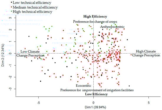 Results showed two clearly independent dimensions (see Figure 5) that explain 52.28% of the total variance. In Figure 5, the horizontal axis represents climate change perception. Farmers on the right side are more sensitive and farmers on the left side are less sensitive to climate change problems. The vertical axis represents TE, environmental attitudes, and preferences for significant actions against climate change. Farmers on the upper part are more efficient compared to the lower part. The same description also holds for anthropocentric and ecocentric attitudes. Finally, the preference for crop changes is located on the opposed side of the preference for improving irrigation systems as adaptation actions.
