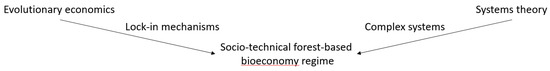The sociotechnical regime is used in this work as a central theoretical approach for study of the forest-based bioeconomy in Finland. The regime is complemented by concepts of lock-in mechanisms and complex systems from evolutionary economics and systems theory, as presented in Figure 1.