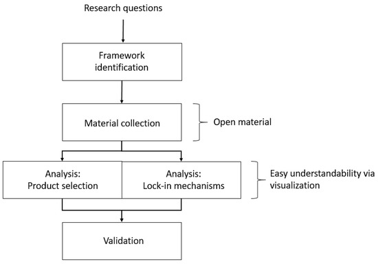 In the research design of this paper, as presented in Figure 2, the forest-based bioeconomy framework in Finland is first identified based on the research questions. This study is limited to the forest-based bioeconomy in Finland. Then, relevant material in this framework is collected, preferring academic literature if possible. The time horizon starts from the beginnings of Finnish industrialization in 1850, when the sawmill industry expanded and wood-based pulp production began [75]. The material collected through the operative framework is utilized as input for the analysis. The analysis is divided into the analysis of product selection and lock-in mechanisms based on the research questions. Finally, the results of the analysis are validated. Transparency is promoted by describing the used material and visualization.