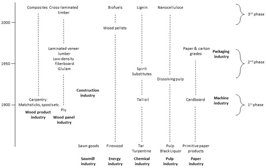 The original product range has diversified in three phases, as can be seen in Figure 3: the first wave of diversification was around the 1900s, the second in the 1950s, and third wave in the 2010s. Industrial symbiosis between the wood processing and machine industries is first found in the product diversification of the 1900s. In the 1950s, war reparations, a trend towards disposable packaging, and office work accelerated cross-industry cooperation: the product range diversified into commercialization of byproducts and related diversification without losing the focus on wood-based products [64]. A new product diversification phase began in the 2010s. It has been broader than earlier, but new robust industrial symbiosis has not yet developed.