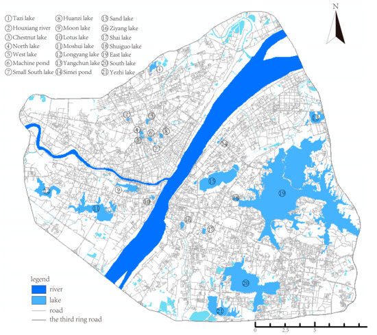 This study aims to establish a model based on the distribution of POI of surrounding facilities in the urban waterfront, predicting the number of tourists to the waterfront, and defining this number as the potential value of attracting tourists to the lake. The geographical location data of social media platforms reflect the actual number of tourists attracted to the lake. In this study, the potential and actual values were compared, and the reasons for the differences were explored from the perspective of the distribution of various POI in each waterfront area to provide suggestions and references for planning waterfront areas in the future. To facilitate quantitative research, the ring-shaped area along the lakeshore of each lake is defined as the corresponding waterfront of the lake. After repeated tests using ArcGIS10.5, concentric rings extending 200, 400, and 600 m outward from the lake were determined as the three-level buffer zone according to the geographical scale of Wuhan and each lake. Considering the number and level of facilities and Sina Weibo users’ check-in points, we chose the 600-m scale as the scope of the waterfront area covered in this study. The buffer zones referred to below are areas extending 600 m from the shore. In this study, the location information of tourists is obtained through social media platforms. The geographic location data of tourists are fitted by the distribution of eight types of POI, namely, entertainment, catering, transportation, public services, medical treatment, education, life services, and accommodation services. Multiple linear regression was used to establish the fitting model to explore the correlation between POI distribution and user distribution in the waterfront. On the basis of this spatial correlation, the POI aggregation degree of the waterfront was analyzed using the kernel density method. Accordingly, the reason for the differences between the actual value and potential value of the lake in attracting tourists was explored. Section 2 describes the basic social and natural background of the study area and data content used in this study. Section 3 presents the methods proposed, including building a model to calculate the tourist attraction potential of the lake based on the distribution of various POI, using multiple linear regression method, and analyzing the distribution of various POI through kernel density method. Section 4, Section 5 and Section 6 explain the results, discussion, and conclusions of the study.