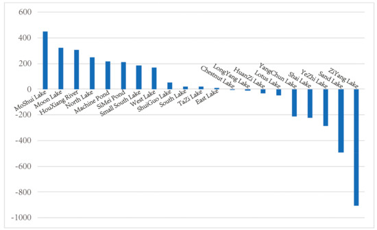 where A–H represent the number of leisure, catering, transportation, public service, medical, educational, living service, and accommodation facilities, respectively. The potential value of each lake to attract tourists and the difference between the potential value and actual value are obtained through the model calculation (Table 4). The difference values were counted (Figure 5). In more than half of the major lakes within the third ring road of Wuhan, the actual number of tourists attracted to the lakes was greater than their potential value. Among them, the actual number of tourists attracted to the buffer zones of Moshui Lake, Moon Lake, Houxiang River, North Lake, Machine Pond, Simei Pond, Small South Lake, and West Lake is far greater than the potential value. This result indicates that the number of tourists in these waterfront areas exceeds the bearing capacity of the layout of its facilities. The actual number of tourists attracted to the buffer zones of Shuiguo Lake, South Lake, Tazi Lake, East Lake, Lotus Lake, Huanzi Lake, Longyang Lake, and Chestnut Lake is close to the potential value and reaches basic saturation. However, the actual number of tourists attracted to the buffer zones of Ziyang Lake, Sand Lake, Yezhi Lake, Shai Lake, and Yangchun Lake is far lower than its potential value. This result indicates that the number of facilities in these waterfront areas fails to meet the needs of tourists and the value of its waterfront space is yet to be developed. Moreover, the spatial utilization of the surrounding area of more than 60% of the lakes does not match tourists’ expectations. The potential value of major waterfront areas in the third ring road of Wuhan has not been fully tapped yet. Therefore, further measures should be taken to plan the urban space in these locations.