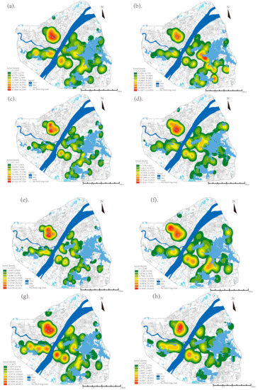 Kernel density of various POI in the lake buffer zone: (a) leisure, (b) education, (c) catering, (d) transportation, (e) living service, (f) accommodation, (g) medical, (h) public service.