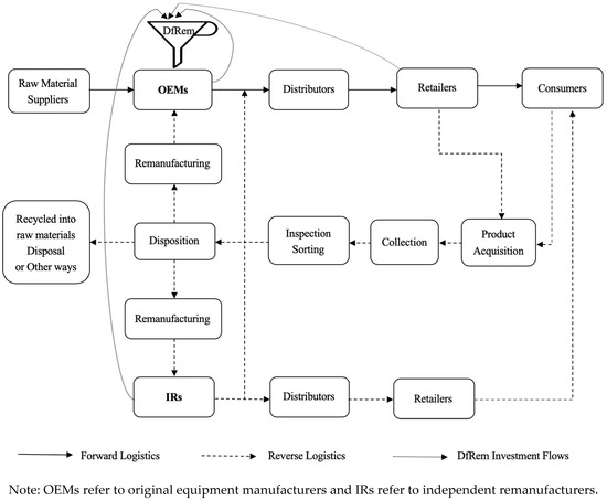 The aim of this paper is to provide other scholars with a more comprehensive understanding of DfRem research issues and to establish an integrated DfRem-driven research framework for subsequent scholars to better conduct modeling research on DfRem. Based on the literature review and enterprise practice analysis, this paper firstly summarizes the key research contents of DfRem from the perspective of supply chain modeling and proposes the system framework and processing method of supply chain model design considering DfRem. Then, we systematically and comprehensively expound relevant modeling research of the “DfRem-driven closed-loop supply chain decision” (see Section 3.1 for DfRem-driven model design elements, Section 3.2 for DfRem-driven investment decision modeling, and Section 3.3 for two-stage model decision-making process consideration DfRem) and provide a model reference basis for subsequent DfRem-driven research. This paper demonstrates the impact of DfRem on the remodeling of the traditional supply chain structure and relationships (involving DfRem investment partnership among supply chain members, the contradictory relationship of “relying on raw materials (i.e., used products) but competing with finished products”) and guides enterprises to better adapt to the emerging business operation environment (such as intelligent manufacturing and computer-aided design) and achieve sustainable development through the adjustment of operational decisions.