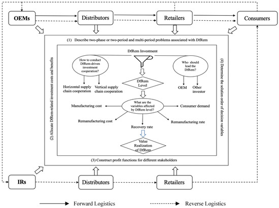 As shown in Figure 9, the DfRem activity has a fundamental and overall impact on traditional supply chain operation by integrating the contents of the above-mentioned 2–3 parts. It not only affects the competition and cooperation among participants in the supply chain, but also influences the decision-making process of participants. DfRem makes the various participants and elements of the closed-loop supply chain (such as the product flow and the capital flow) more integrated. In terms of closed-loop supply chain modeling, DfRem’s intervention in supply chain operation decisions is mainly reflected in DfRem-related investment decisions, DfRem-related production and operation decisions, and DfRem-related performance evaluation and multi-cycle operation problems. Specific DfRem-related decision-making issues are as follows: