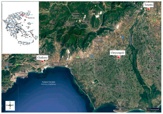 The climate of this area belongs to the type Csa according to the Koeppen classification system. On the basis of the available data of the nearest meteorological station of Kavala city, the mean annual temperature is 14.6 °C, and the mean annual rainfall is 602 mm. The mean monthly temperature during the coldest month (January) is 4.2 °C, and that during the warmest month (August) is 26.0 °C, while the prevailing wind is from the southeast (SE) [26].