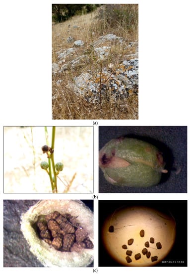 Photo of the species V. dingleri: (a) in situ photo near Chalkero village, showing the dominant site characteristics; (b) fruits of V. dingleri; (c) seeds of V. dingleri (photos from a stereomicroscope).