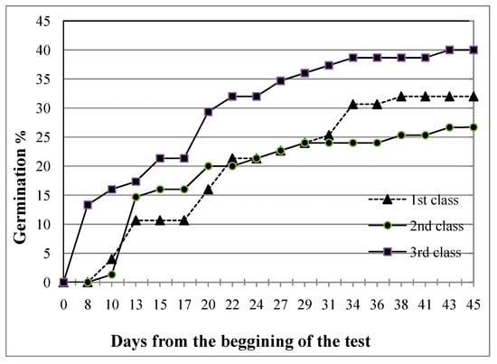 Before assessments, the seeds were surface-sterilized using 0.85% sodium hypochlorite for 1 min, after which they were washed with distilled water. Four replicates of 25 seeds for each of the three fruit classes were placed in glass Petri dishes (9 cm diameter) containing a layer of filter Whatman paper wetted with distilled water. Parafilm M® was used for wrapping the Petri dishes to restrict any moisture loss, while distilled water was added as needed to provide seeds with an adequate moisture level. The Petri dishes were placed in a plant growth chamber at a constant temperature of 20 °C. This temperature was selected on the basis of the existing data for other species of the genus Verbascum [21,22]. The fruit size effect on seed germinability was studied by testing the seeds of four fruits per fruit class (1st, 2nd, and 3rd). Seed germination was checked every two days; water was added as needed during the period of the germination test. The criterion for establishing germination was the emergence of a radicle with length of approximately 2 mm [23]. The experiment was terminated when no seeds germinated for one week. The cumulative germination percentage was evaluated every two days, and the final germination after 28 days. The germination percentage was calculated as the average of four replicates of 25 seeds according to Equation (1), and the mean germination time (MGT) was calculated according to Equation (2) [24,25].