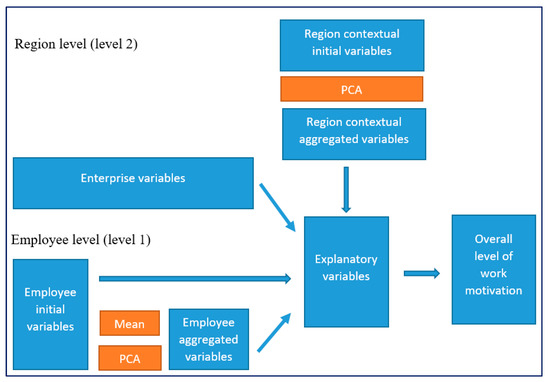Consequently, in the next phase, in order to identify the main determinants of work satisfaction of Romanian employees, a multilevel logistic regression analysis based on the hierarchical nature of the data (individuals within regions), which includes the individual-level variables, and then explores whether each region-level independent variable is significantly associated with higher levels of job satisfaction, was used. The conceptual framework of employees’ overall level of work motivation model is presented in Figure 1.