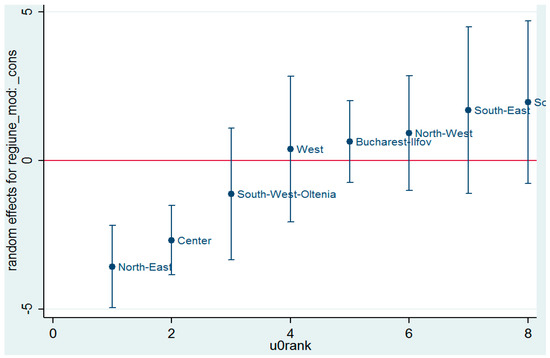 The three regions with the lowest probability of being satisfied at the job (largest negative values of ûj) are North-East development region, Center development region and South-West development region, while the three with the highest response probability (largest positive values of ûj) indicating a significantly higher level of work motivation compared with the general regional average are North-West development region, South-East development region and South-Muntenia development region.