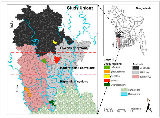 Due to a lack of resources and time constraints, it was not possible within the scope of this study to conduct an empirical investigation of all the coastal regions of the country. Instead, a field study was conducted in five communities in the southwest coastal region. These communities were selected based on the extremity of their exposure to cyclones (Figure 2): two highly exposed communities (namely, Padmapukur village in the Uttarbedkashi union, Khulna district, and Chakdah village in the Mathureshpur union, Satkhira district), two moderately exposed communities (namely, Shovna village in the Shovna union, Khulna district, and Vabanipur village in the Islamkati union, Satkhira district) and one less-exposed community (namely, Panchkori village in the Nehalpur union, Jessore district). The general socio-demographic characteristics of these selected villages are presented in Table 1.
