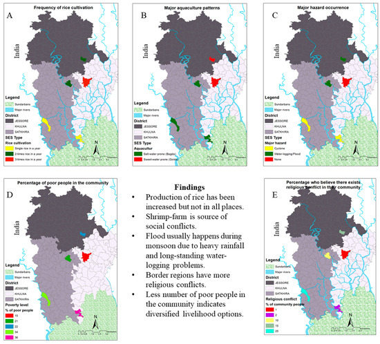 A summary of the SES characteristics is presented in Table 3 and Figure 3. Two major types of aquaculture practice, shrimp and Golda (a local variety of river prawn), are observed in the studied villages (see Figure 3B). The extent of these practices depends upon and varies according to the availability of saline water, which is itself dependent on proximity to rivers. Two out of the five studied communities have no salinity problems and therefore more opportunity for rice production, which helps in keeping the level of poverty low in these villages. Flooding is identified as the major hazard, usually occurring during monsoons due to heavy rainfall and long-standing water-logging problems.
