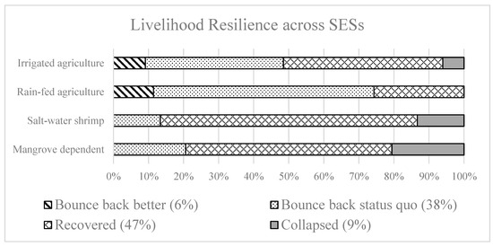 There was no ‘collapsed livelihood resilience’ case in rain-fed agriculture, but ‘bounce back status quo’ shows the highest percentage and ‘bounce back better’ the lowest percentage. The majority of the ‘recovered’ resilience groups lived in salt-water shrimp SESs. The reasons for their recovery mentioned during discussion were twofold: firstly, having been inundated for several months, they could fish in the canals and rivers, and secondly, ample relief and reconstruction support from both the government and non-government sectors was made available.
