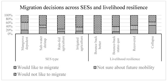 This research aims to ascertain how, and to what extent, livelihood resilience influences migration decisions (to migrate or not to migrate) of people who live in vulnerable socio-ecological systems (SESs). To do so, first, the characteristics of different SESs are determined; secondly, livelihood resilience across the SESs are analysed; and finally, the influence of livelihood resilience on the ‘migration decision’ (i.e., to migrate or not to migrate) is explained. The explanation of migration is based on the patterns, location, purpose, scope, and extent of migration. This paper addresses these issues based on empirical evidence from five rural coastal communities in Bangladesh. Findings show that resilient people would like to stay put and the decision differs across SESs, for example, the majority of people living in salt-shrimp-dependent SESs intended to migrate in the future, whereas the majority of people living in rain-fed agriculture-dependent SESs preferred to not migrate. Thus, the ability to migrate is therefore not only dependent on economic capability but also on the socio-ecological context of the place in which people live.