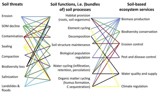 The potential linkages between soil threats, soil functions, and soil-based ecosystem services from [16].