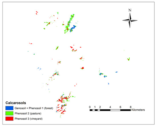 Another example of these analyses includes Calcarosol and the same attributes and depths as the previous example. Here, we compare Calcarosols under forest (combined native forest with sparse forest genosoil 1 and phenosoil 1 in [33]) with Calcarosols in pastures (phenosoil 2) and vineyards phenosoil 3 (Figure 3). In this case, the soil properties of Calcarosols under forest were combined because we had only three soil profile observations under dense forest and seven under sparse forest. All combined forest samples are considered as the reference state. The Calcarosols under pasture, Calcarosol phenosoil 2, are compared [33] with the references state (forest) and other land uses, vineyards.
