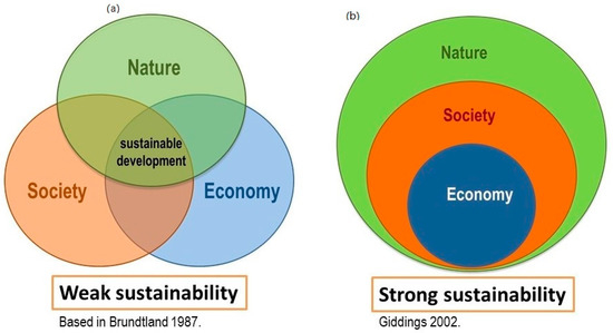 Figure 1 presents the comparison between weak sustainability (sustainable development) and strong sustainability; the diagram on the left assigns the same weight to the three themes: Economy, environment, and society, conceiving the possibility of an economy or a society outside the environmental framework, i.e., it does not recognize that society depends entirely on the biosphere and that the economy is a social subsystem, so it is totally incoherent with the laws of thermodynamics [15]. Efforts of sustainable development are inspired by the belief that economic growth and technological development would solve social and environmental problems. In this sense, the proposal of the Brundtland Report of a “new era of economic growth” was deeply flawed; human society around the world established goals and focused its determination on attaining these economic aspirations, and the lack of improvement in the socio–ecosystemic problems of the last four decades are not surprising.