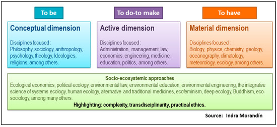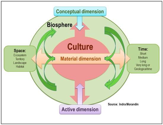 Graphic representation of the socio–ecosystem sustainability dimensions. Culture is framed by the biosphere, in which three dimensions converge: Conceptual, active, and material, in which the space–time phenomenology is presented.