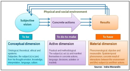 The active dimension (in violet) refers to the practices, actions, and methodologies (individual and collective) conducted in daily life. It represents the manifestation of the subject, expressed in its decisions, activities, and inactivity. This dimension has measurable and objective elements, but it is influenced by the conceptual dimension, i.e., the people realize their concrete actions according to the knowledge, scale of values, and emotions that constitute their subjectivity.