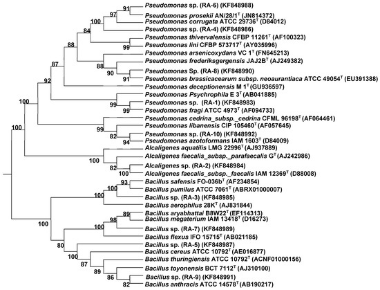Diversity in rhizosphere bacteria with varying physiological and biochemical traits were identified to the species level of all isolates. Out of 10 bacterial strains, five strains were identified from the genus Pseudomonas as RA-1 (Pseudomonas fragi), RA-4 (Pseudomonas corrugata), RA-6 (Pseudomonas arsenicoxydans), RA-8 (Pseudomonas brassicacearum subsp. neoaurantiaca), and RA-10 (Pseudomonas azotoformans); four strains belonged to the genus Bacillus, these were RA-3 (Bacillus sefensis), RA-5 (Bacillus cereus), RA-7 (Bacillus aryabhattai), and RA-9 (Bacillus thuringiensis); and one strain belonged to the genus Alcaligenes, which was RA-2 (Alcaligenes faecalis subsp. faecalis). For phylogenetic tree construction (Figure 1) we obtained closely related taxa of our strains from BLAST search using the eztaxon server. All strains were also identified by analysis through the Sherlock microbial identification system (MIDI) (Library RTSA6 6.0, MIDI Sherlock software package, version 6.0) for cellular fatty acid profile composition (Table 2).