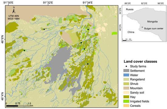 Location of the study area within Mongolia (right) and a detailed land-cover map of the river oasis of Bulgan sum center (2013), which includes the location of the study farms (left); modified map based on [8].