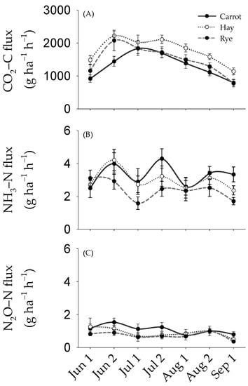 In contrast to CO2–C, NH3–N and N2O–N flux rates followed a multimodal pattern (Figure 2B,C). Thus, NH3–N flux rates ranged between 1.6 g ha−1 h−1 for rye plots at the beginning of July and 4.3 g ha−1 h−1 for carrot plots at the end of July. N2O–N emission rates varied between 0.4 g ha−1 h−1 for rye plots at the beginning of September and 1.5 g ha−1 h−1 for carrot plots at the end of June. Highest mean NH3–N emission rates were measured in carrot plots (3.3 g ha−1 h−1), while lowest ones were observed in rye plots (2.4 g ha−1 h−1). An average of 3.0 g of NH3–N ha−1 h−1 was determined in hay plots. The same order was observed for N2O–N flux rates: the highest mean value was observed in carrot plots (1.1 g ha−1 h−1), a lower one was observed in hay plots (0.9 g ha−1 h−1), and the lowest one was recorded in rye plots (0.7 g ha−1 h−1).