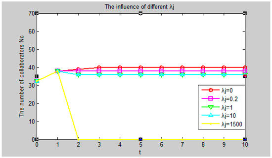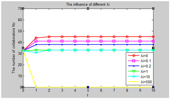When the values of other factors remain unchanged, suppose = 0, 0.1, 0.2, 1, 10, 500 respectively. The simulation results are shown in Figure 3.