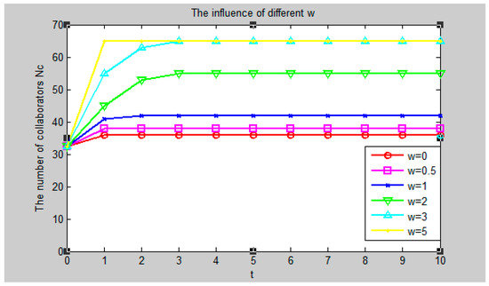 When the values of other factors remain unchanged, suppose w = 0, 0.5, 1, 2, 3, 5 respectively. The simulation results are shown in Figure 5.