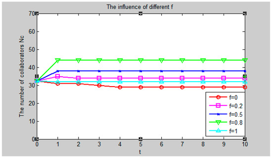 When the values of other factors remain unchanged, suppose f = 0.5, 0.2, 0.8, 0, 1 respectively. The simulation results are shown in Figure 6.