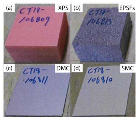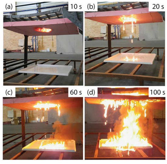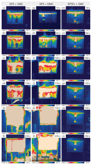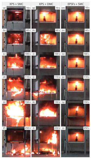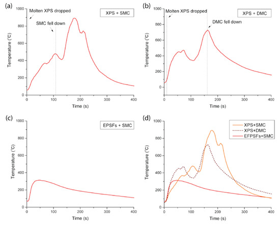 - When the structure in which the XPS was used as the thermal insulation material was exposed to an ignition source in the small-scale test, the molten XPS accumulated from 15 s after the test start, and the ignition sources increased, thus increasing the fire intensity. After that, the fire intensity increased further as the ceiling materials (SMC, DMC) were deformed and outside air flowed in. As a result, the ceiling materials collapsed. However, when EPSFs were used as thermal insulation materials, the fire temperature increased to 300 °C, and then the fire was weakened and extinguished due to lack of oxygen.